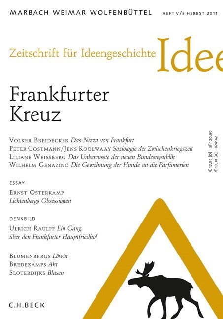 Das Herbstheft der Zeitschrift für Ideengeschichte spürt einer mächtigen Ideenkreuzung des letzten Jahrhunderts nach - dem Frankfurter Kreuz. Im Zentrum des Heftes steht das geistige Frankfurt der Zwischenkriegszeit: ein spannungsgeladener Ort, an dem Marxisten, Georgeaner und Außenseiter wie Karl Mannheim ihre Lager aufgeschlagen hatten. Seitenblicke werden auf die alte Frankfurter Zeitung und ihren künstlerischen Stern Max Beckmann, das Frankfurt der Psychoanalyse und die kritischen Spötter der Neuen Frankfurter Schule geworfen. Wilhelm Genazino flaniert literarisch leichtfüßig für uns durch seine Stadt. Ulrich Raulff erzählt bei einem Gang über den Hauptfriedhof, was uns die Namen der berühmten Frankfurter Toten verraten - von Schopenhauer bis Robert Gernhardt.