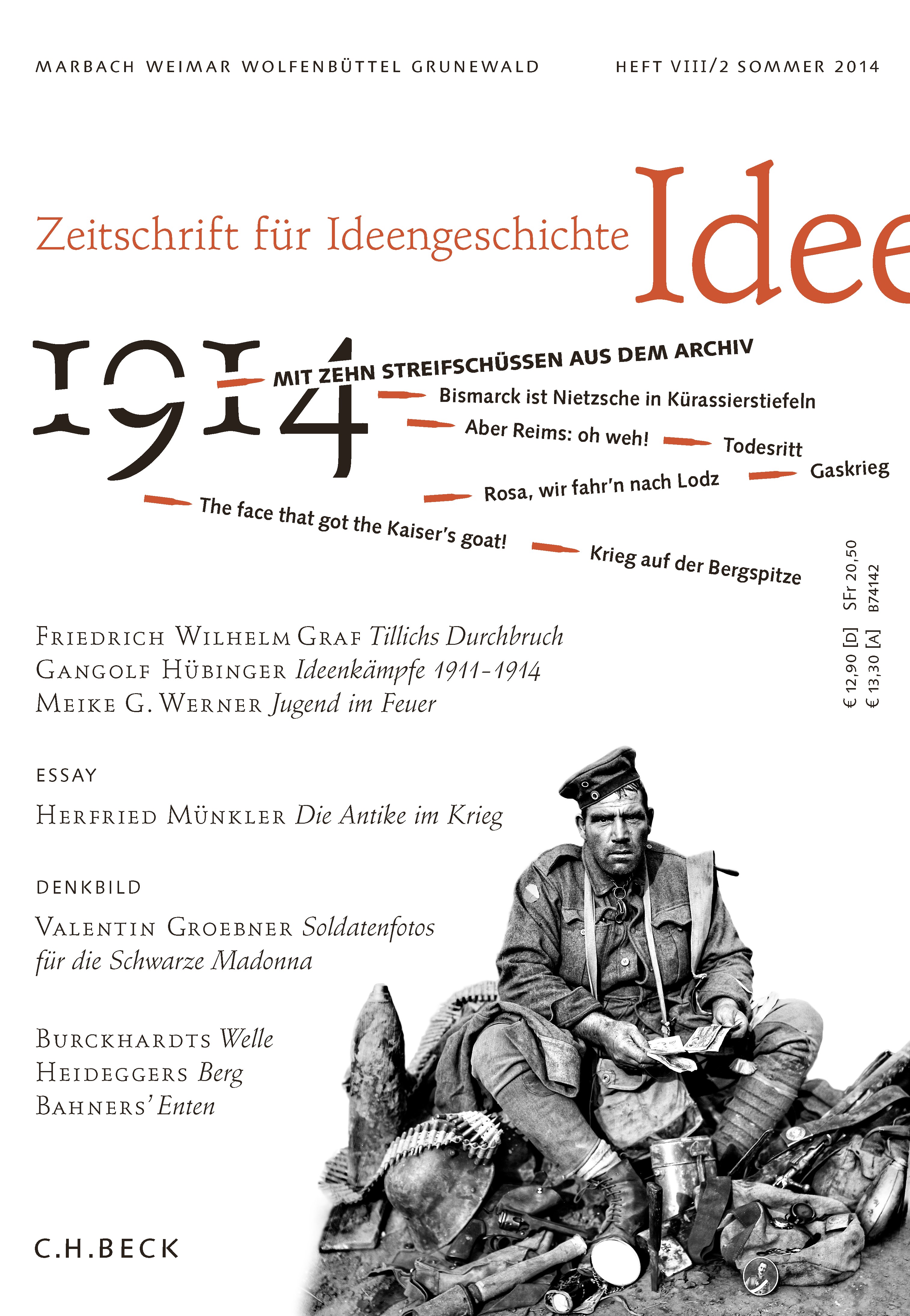 Sommer 2014 - die Zeitschrift für Ideengeschichte spürt dem Jahrhundertdatum „1914“ nach. Aber nicht auf der Vorderbühne der militärischen Ereignisse, sondern auf der Hinterbühne der Ideen. Hier verlaufen die Fronten unübersichtlicher, erleben wir erstaunliche Aufrüstungen, unheimliche Allianzen und abgründige Nachbarschaften. Zehn Streifschüsse aus dem Archiv beleuchten den Großen Krieg auf überraschend neue Weise.